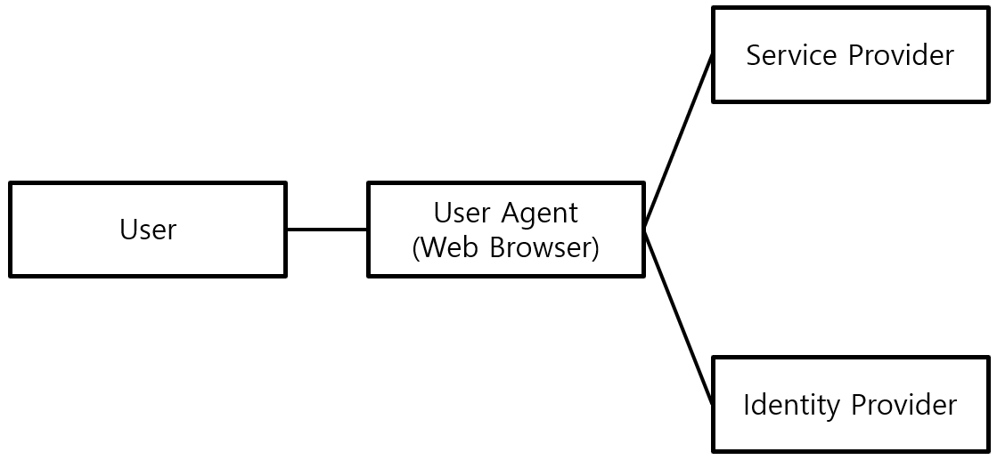 Web 환경에서 SAML 2.0를 이용하여 인증/인가 기능을 구성했을때 SAML 2.0의 구성요소를 나타내고 있다. User는 Service 이용자를 의미한다. User Agent는 User의 입력을 받아 Service/Identity Provider에게 전달하거나, Service/Identity Provider으로부터 받은 내용을 User에게 보여주는 역할을 수행한다. 일반적으로는 Web Brower를 의미한다.