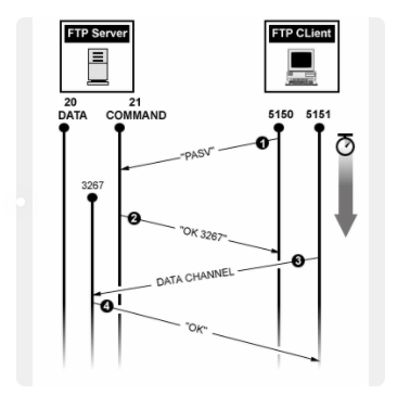 - Server가 응답, Server가 수신에 사용할 데이터 전송 포트를 Client에게 통보 (ex. tcp 3267)
