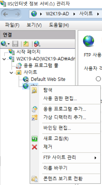 서버 관리자에서 오른쪽 위 도구 탭 - IIS 관리자를 고른다.
