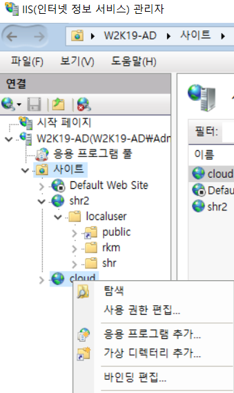 바인딩에 cloud라고 설정한 가상 호스트 서버에 shr로 로그인 한 것이다.
