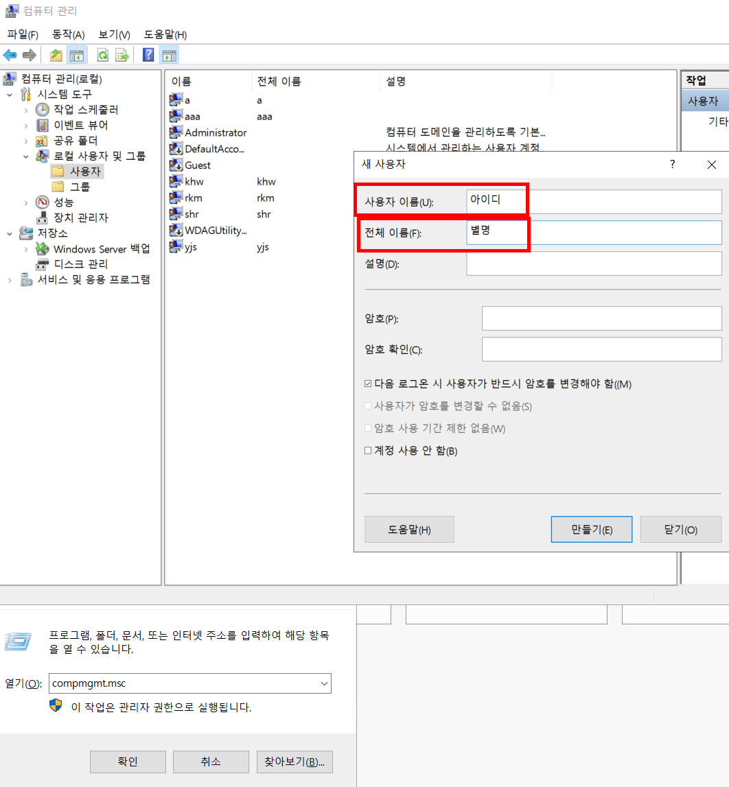 아이디를 생성해 준다. 참고로 사용자 이름에 적는 것은 UID 같이 진짜 인식하는 아이디이고