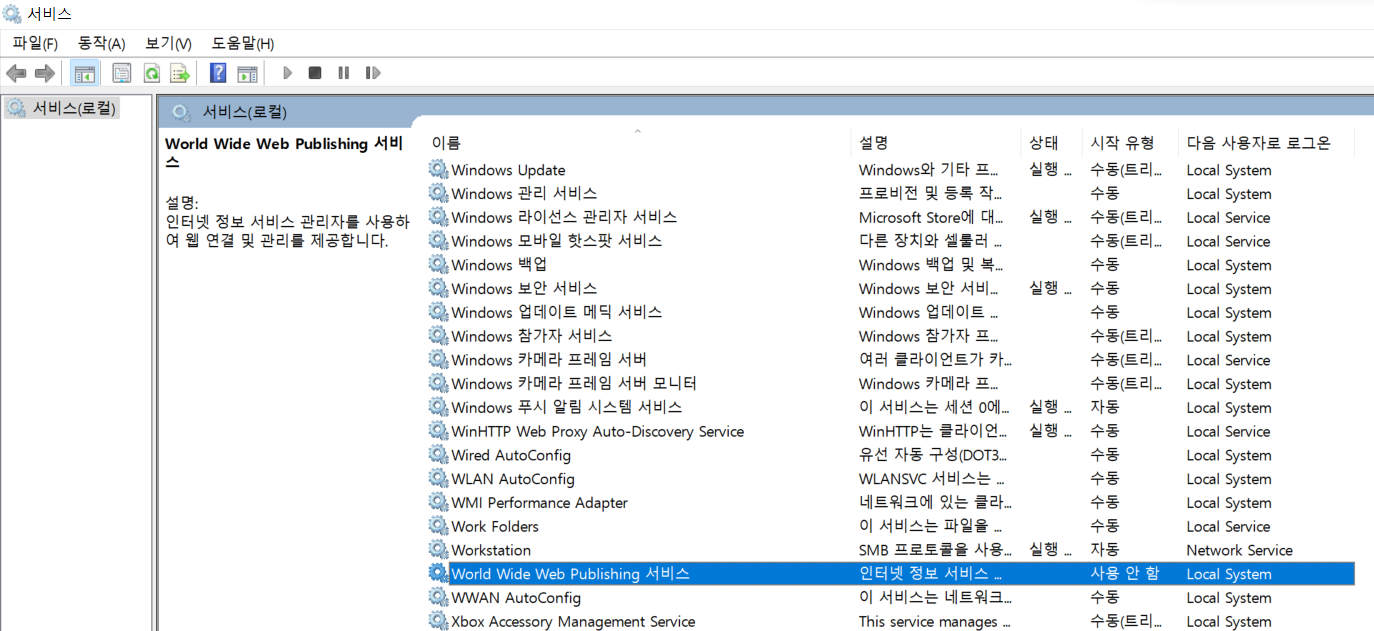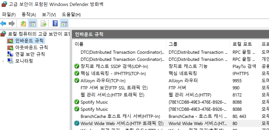 방화벽을 확인해 보니 월드 와이드 웹 서비스라는 놈이 80번을 점유하고있다.