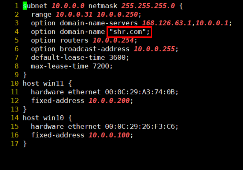 아래는 /etc/dhcp/dhcpd.conf 설정 할 때 적은 shr.com 주소가 있다.