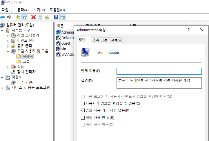 계정 사용 안함을 체크 해제한다.