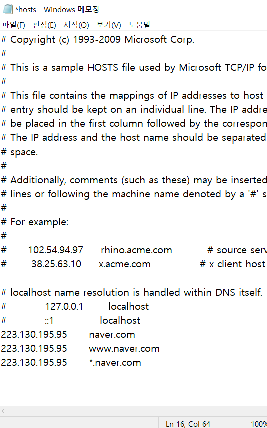아래와 같이 danawa와 nsmail의 경로에 ip를 미리 지정해 놓으면 hosts를 먼저 참조하기 때문에 여기의 ip로 접속된다.