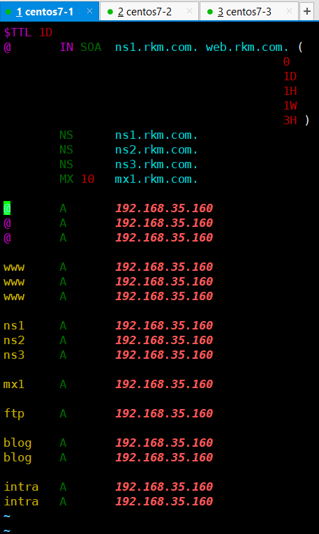 (아래는 rkm.com이라는 사이트를 본인 DNS에 등록하는 존파일 설정 장면이다.)
