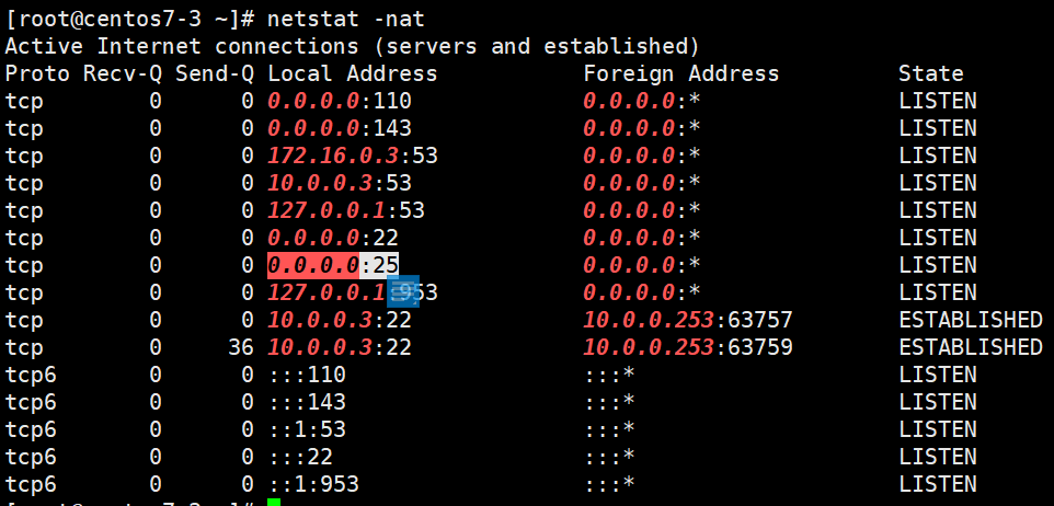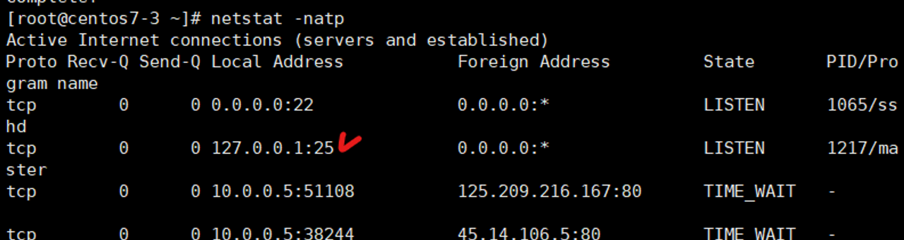 netstat -nat로 25번 포트를 보면 아래와 같이 모든 IP로 개방돼있어야 한다.