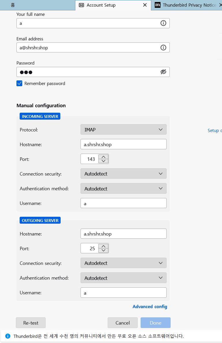 웹메일은 가격이 비싸서 썬더버드라는 웹 클라이언트 프로그램을 써서