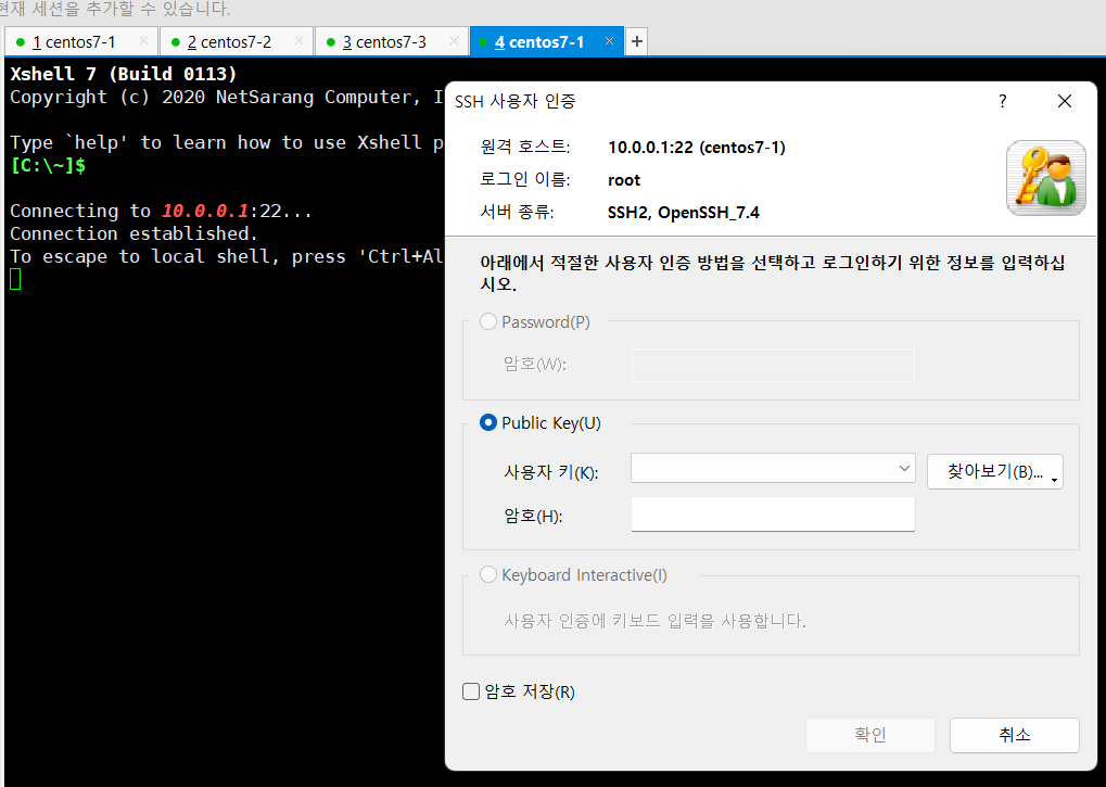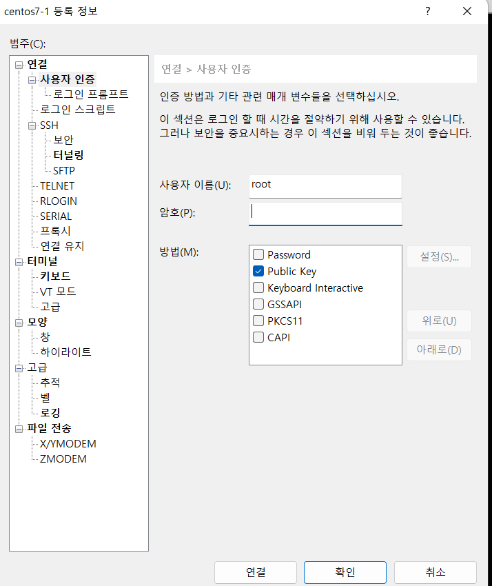 xshell은 ssh 접속하려면 퍼블릭 키로 로그인 하겠다는 옵션을 채크 해줘야 한다.