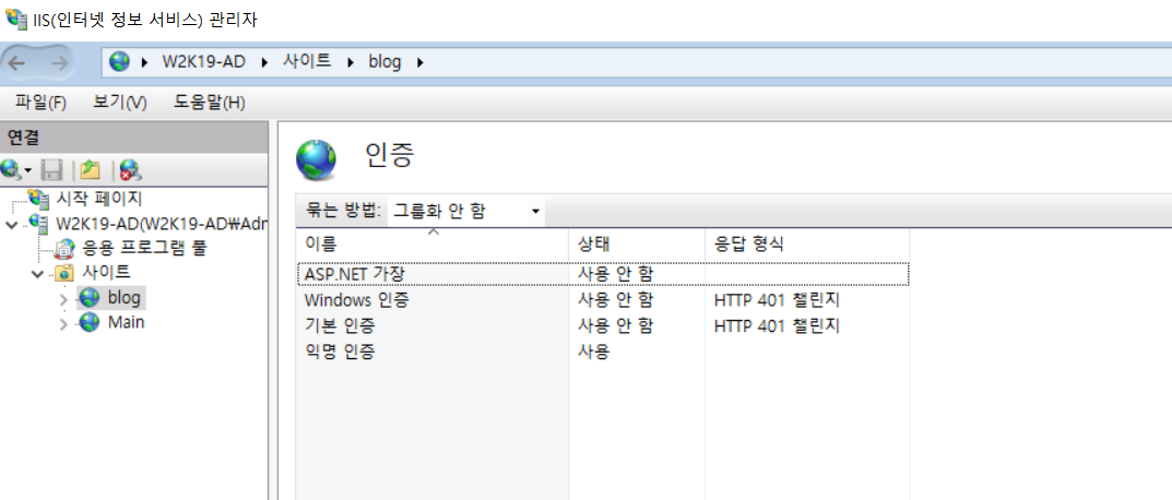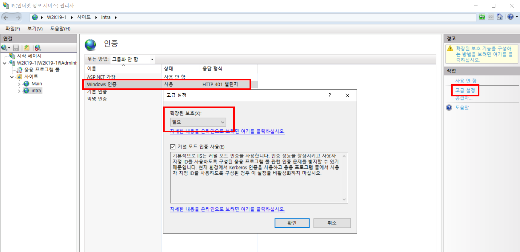 참고로, 윈도우 인증 기능을 사용 하려면 반드시 고급설정에서 확장된 보호 목록을 필요로 바꿔줘야 한다.