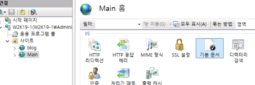 아래와 같이 Main 사이트의 기본문서를 아까 만든 html 경로로 설정해 주자.