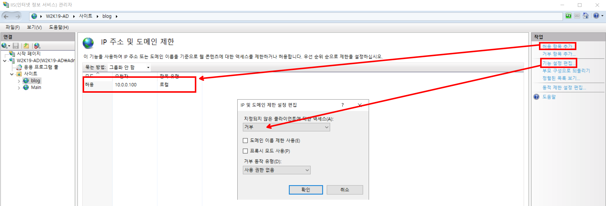 아래는 10.0.0.100만 허용하고 전부 거부하는 설정이다. (blog 사이트)