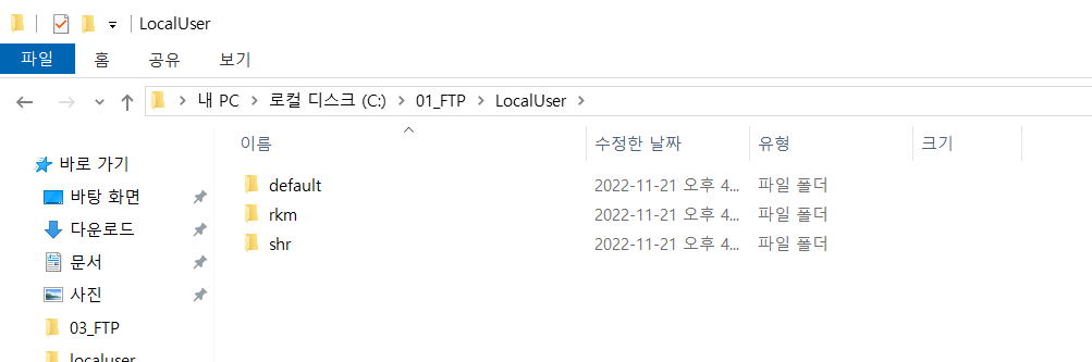 아래와 같이 localuser 폴더와 익명 접속을 위한 default, 그리고 사용할 계정의 홈 폴더를 만든다.
