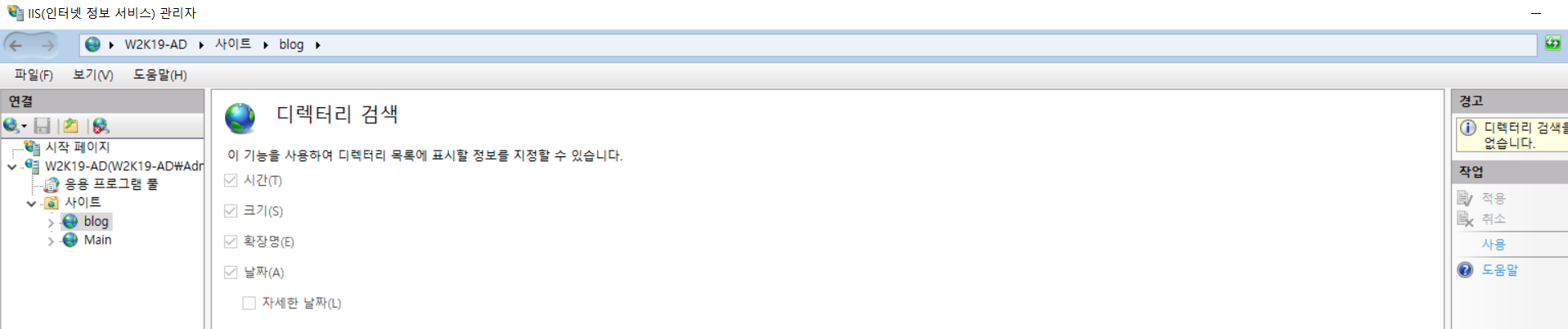 디렉터리 검색 항목은 사이트에 접속 시 하위 디렉터리와 그 옵션을 표시 하느냐 마느냐 하는 항목을 설정 가능하다.