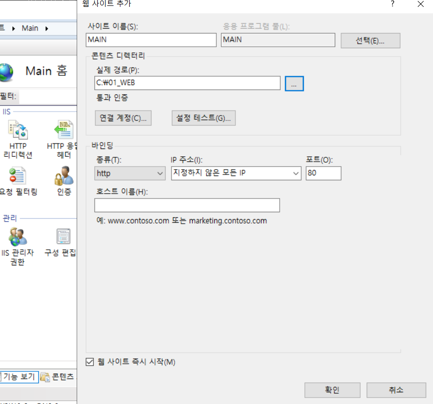 지금 생성하고 있는 사이트(MAIN)의 역할은 호스트 이름란을 비워 놓음으로서