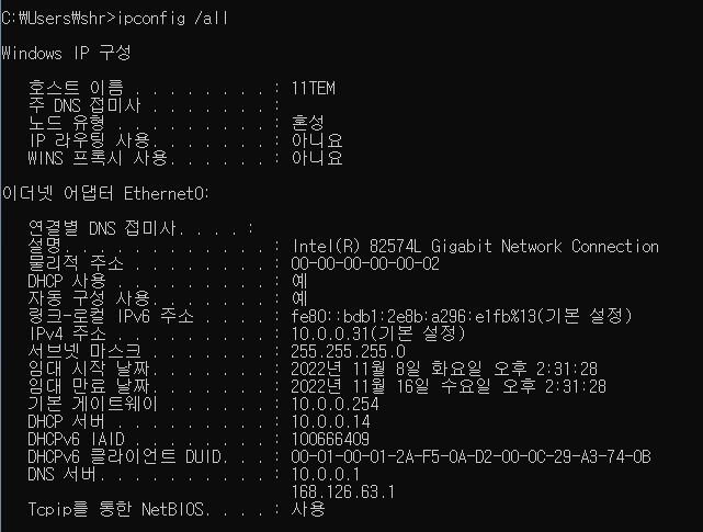 아래와 같이 물리적 주소 (버츄얼 맥)가 바뀌어 나온다!