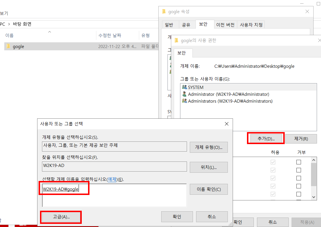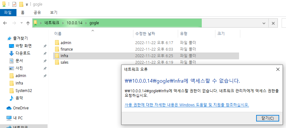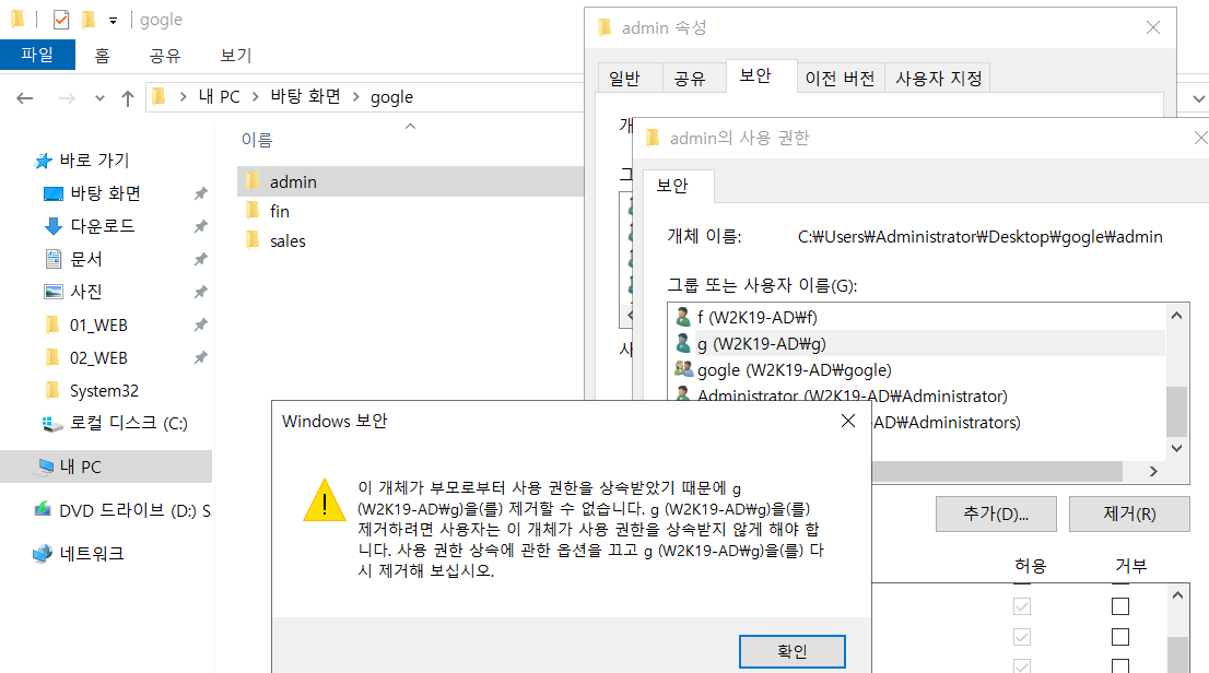 하위 폴더인 admin, fin, sales 등에서 gogle 그룹원을 추가했다가 제거하려고 하면 다음과 같이 안 빠진다.