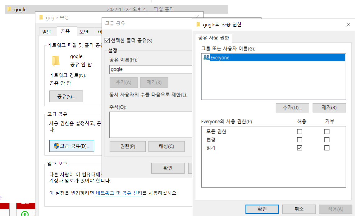아래 공유 권한을 보면 읽기만 체크 돼있다.