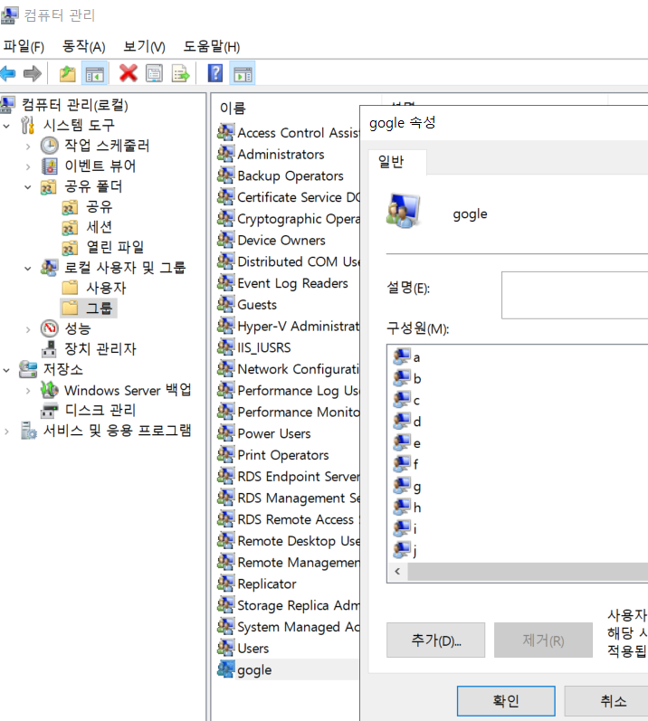 팁 : 각 소유권을 가진 그룹 마다 따로 compmgmt.msc에서 그룹을 만들어 준다.