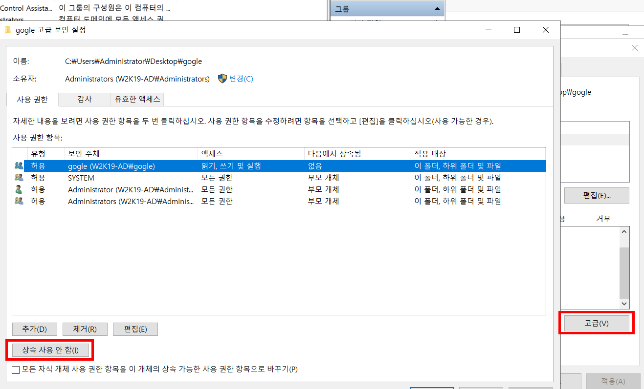 권한도 상속받으면 자식폴더는 그 권한을 수정할 수 없기 때문에 회색으로 체크표시가 돼있어서 수정불가하다.