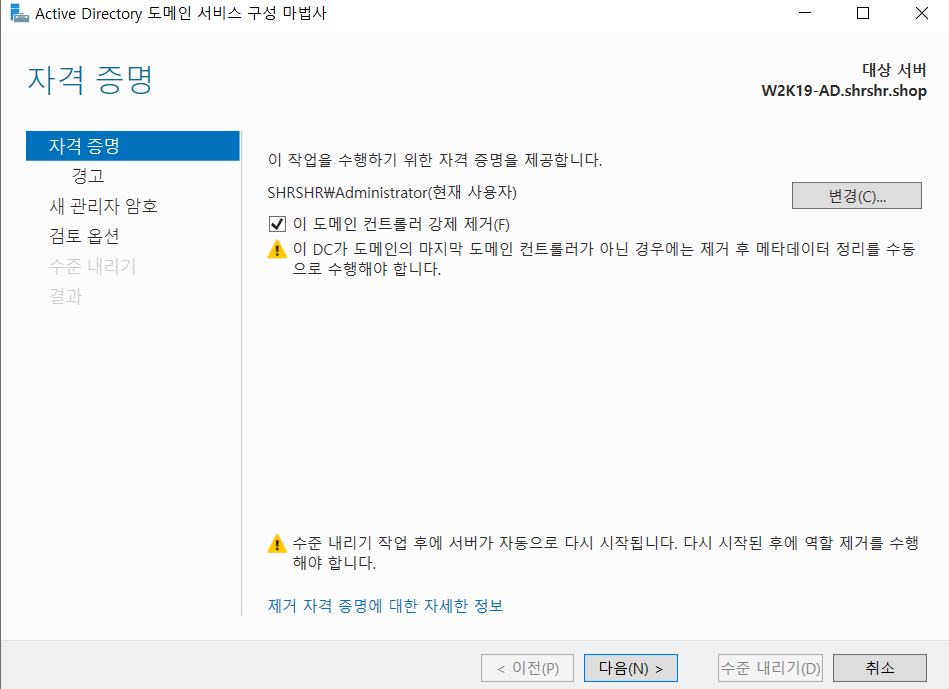 저기 노란 경고문구의 내용의 뜻은, 본 어드민 (현재 사용자)은 무조건 도메인 컨트롤러 수준이 내려가면 삭제되는데,