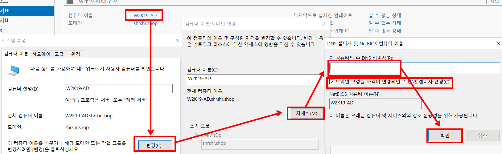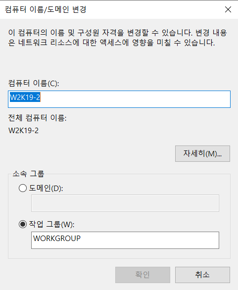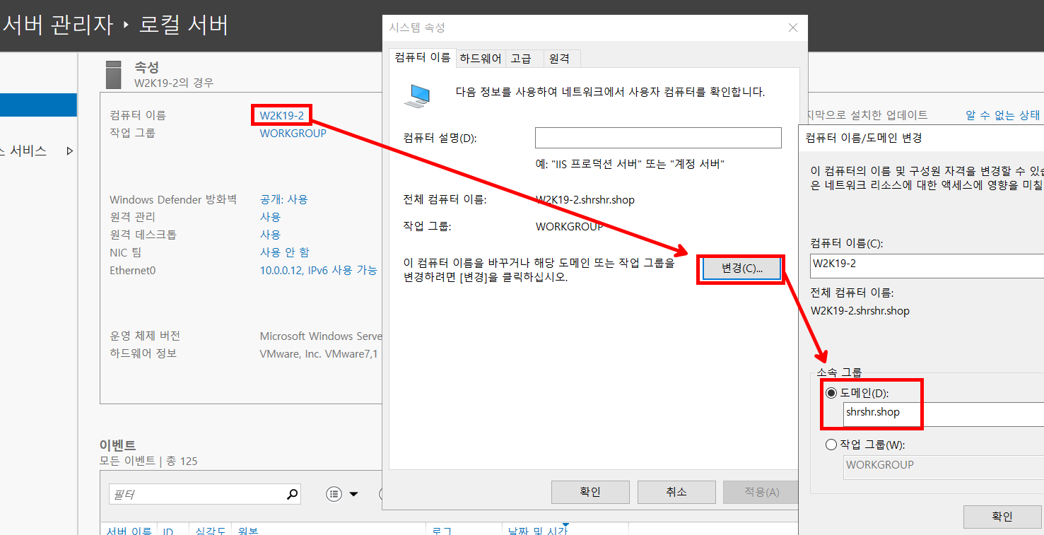 멤버 서버를 워크 그룹(WORKGROUP) 에서 아까 만든 도메인 컨트롤러의 도메인으로 바꾼다.