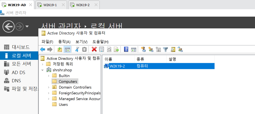 아래와 같이 도메인 컨트롤러 쪽에서도 확인하면 방금 멤버로 가입한 서버의 컴퓨터가 등록돼있다.