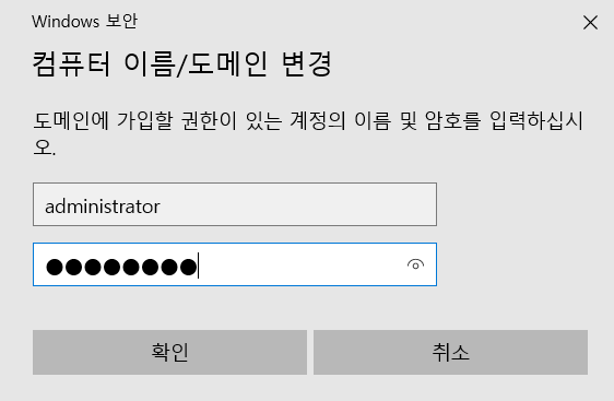 잘 되면 아래와 같이 도메인에 가입할 권한 계정을 요구하는데, 반드시 해당 서버의 도메인 계정으로 해야 권한이 있다.