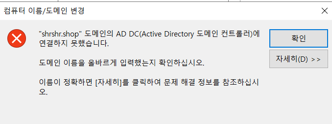 도메인 컨트롤러의 DNS가 작동해야 된다. 아니면 위와같이 뜬다.