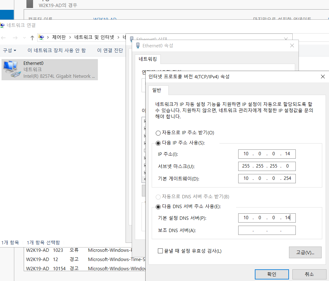 AD 는 철저하게 DNS 에 포함되어 있으므로 DNS 서버를 체크 해 준다.