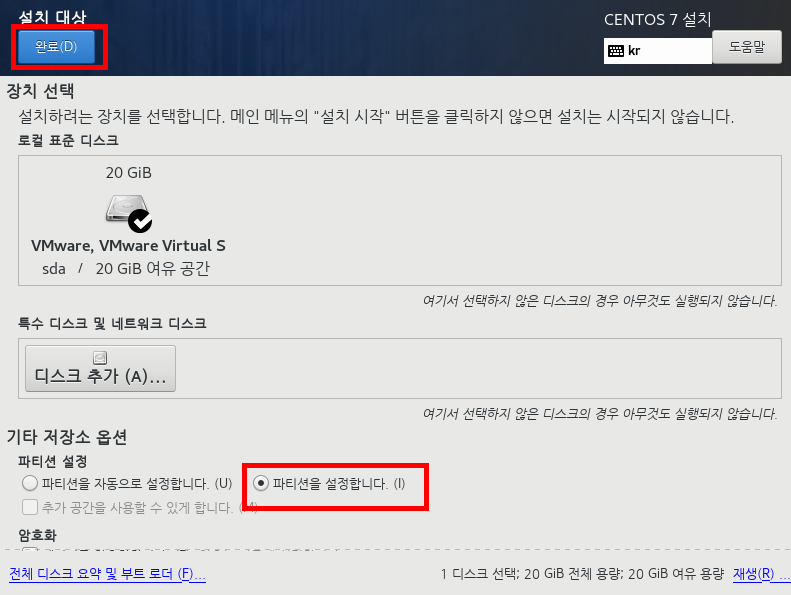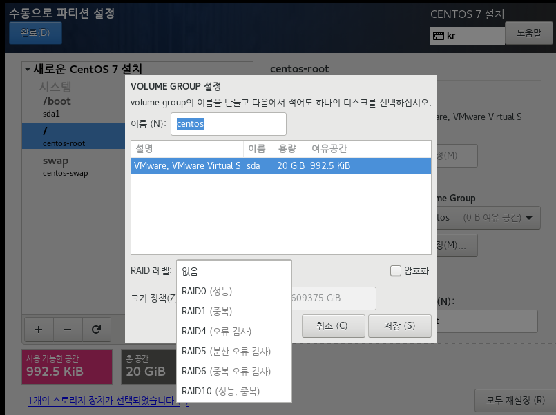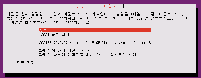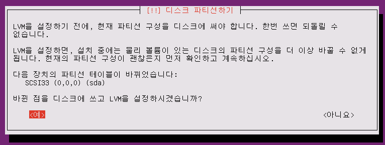 /home 디렉토리를 많이 사용하는 유저 계정 서버라던지, /var를 많이 사용하는 로그 서버라던지 하는 특수 목적의 머신을 구현하려면 지금 여기서 파티션을 설정하기를 눌러 미리 LVM으로 설정하고 VG그룹을 만드는 것이 좋다.