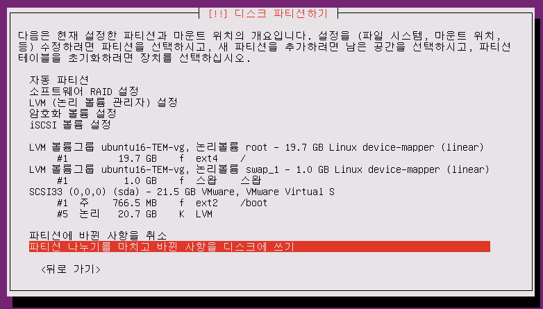 반드시 이후 GRUB 부트로더 설치 (미설치 시 부팅이 안됨)