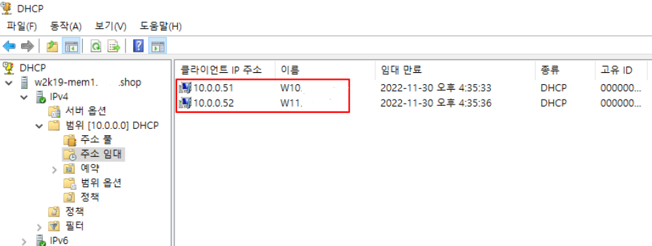 Win10과 Win11 머신에서 DHCP 잘 받아지는 지 확인한다.