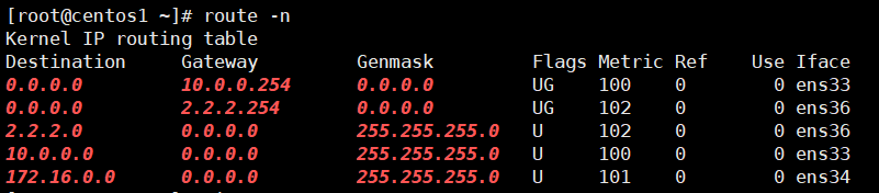 (ens33의 Default Gateway 메트릭 값이 더 낮기 때문에 우선이다)